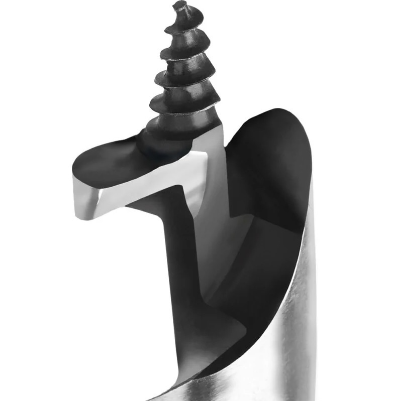 Forma spiralată a tăișului ridică și evacuează eficient așchiile din zona de găurire, accelerând procesul și reducând sarcina asupra burghiului în lemn masiv. Vârful centrat ascuțit ajută la fixarea precisă a burghiului pe suprafață și reduce deplasarea la începutul găuririi, ceea ce este important la lucrul cu diametre mari.
