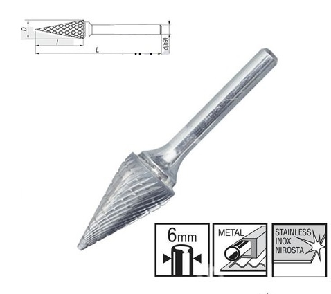 Forma conică ascuțită a frezei oferă un echilibru excelent între îndepărtarea agresivă a materialului și controlul precis asupra prelucrării. Aceasta este ideală pentru finisare, îndepărtarea bavurilor și contururi precise. Tăișul cu nervuri încrucișate Cut 6 facilitează evacuarea eficientă a așchiilor, reduce vibrațiile și asigură o funcționare stabilă a instrumentului chiar și la utilizare îndelungată.