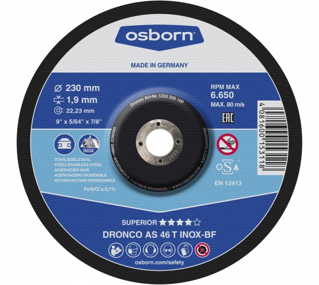 Для высокопроизводительной зачистки деталей и конструкций из различных марок стали, сварных швов. Шлифовальный круг Dronco имеет идеальную балансировку и посадочное кольцо, благодаря которым минимизируются вибрации во время работы. Изделие позволяет получить качественный рез при любых обстоятельствах, особенно при резке тонкого профиля.
