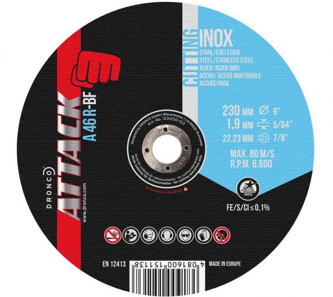 Шлифовальный круг Dronco имеет идеальную балансировку и посадочное кольцо, благодаря которым минимизируются вибрации во время работы. Изделие позволяет получить качественный рез при любых обстоятельствах, особенно при резке тонкого профиля.