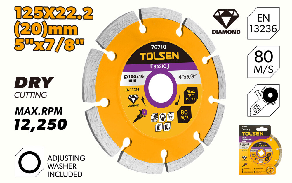 Алмазный отрезной диск диаметром 125 мм предназначен как для сухой, так и для мокрой резки бетона, кирпича, натурального и искусственного камня с использованием угловой шлифовальной машины. Разделение режущей поверхности на сегменты позволяет удалить остатки материала и способствует дополнительному охлаждению. Установленная производительность. Инструменты соответствуют стандарту EN13236.