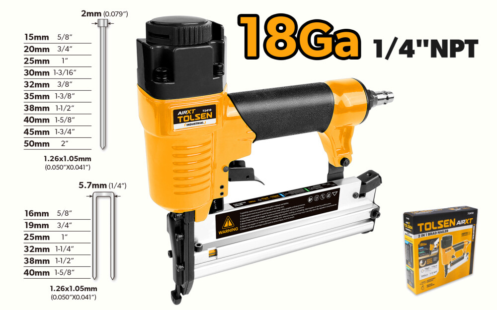 Благодаря поддержке как гвоздей, так и скоб, пневмопистолет может использоваться в широком спектре задач — от мебельного производства до обшивки стен и полов, исключая необходимость иметь два отдельных инструмента.