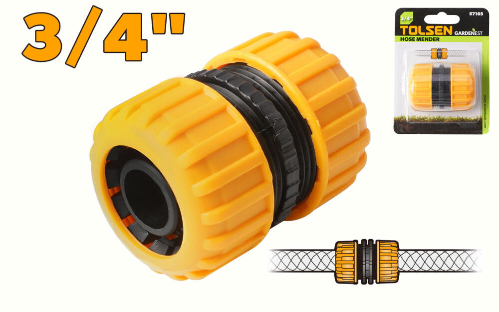 Mufa se potrivește majorității furtunurilor standard de 3/4″, oferind compatibilitate extinsă fără adaptoare. Construcție simplă, fără mecanisme complicate. Înlocuiește porțiunea deteriorată a furtunului în doar câteva mișcări, fără demontări sau etanșanți. Carcasă din PP + ABS. Oferă rezistență la razele UV, substanțe chimice și solicitări mecanice — ideală pentru utilizare în grădină.