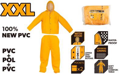 Cu costumul de ploaie Tolsen, poti fi sigur ca vei fi protejat impotriva apei si a altor intemperii. Este fabricat din material PVC de inalta calitate, cu o grosime de 0.32mm, si are captuseala pentru a-ti oferi mai mult confort si caldura, fiind potrivit pentru zilele ploioase si reci. De asemenea, costumul de ploaie are o gluga, buzunare cu clapete si inchidere cu fermoar si capse. Ambalati intr-un sac din PE cu eticheta colorata, costumul de ploaie este usor de transportat si depozitat, fiind ideal pentru a fi luat cu tine oriunde te duci.