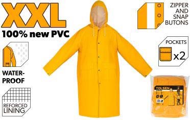 PVC-ul nu absoarbe apa, se curăţă uşor — se şterge cu o cârpă umedă; după uscare nu reţine mirosuri şi nu pierde proprietăţile de protecţie. Cu grosimea de 0,32 mm pelerina oferă o barieră bună împotriva ploii, inclusiv ploaie fină; în același timp, materialul rămâne ușor și flexibil, pentru libertate de mişcare. Mărimea XXL permite purtarea peste haine de lucru sau îmbrăcămintea groasă fără restricţii; util în medii unde este necesară protecţie suplimentară dar nu vreţi să sacrificaţi confortul.