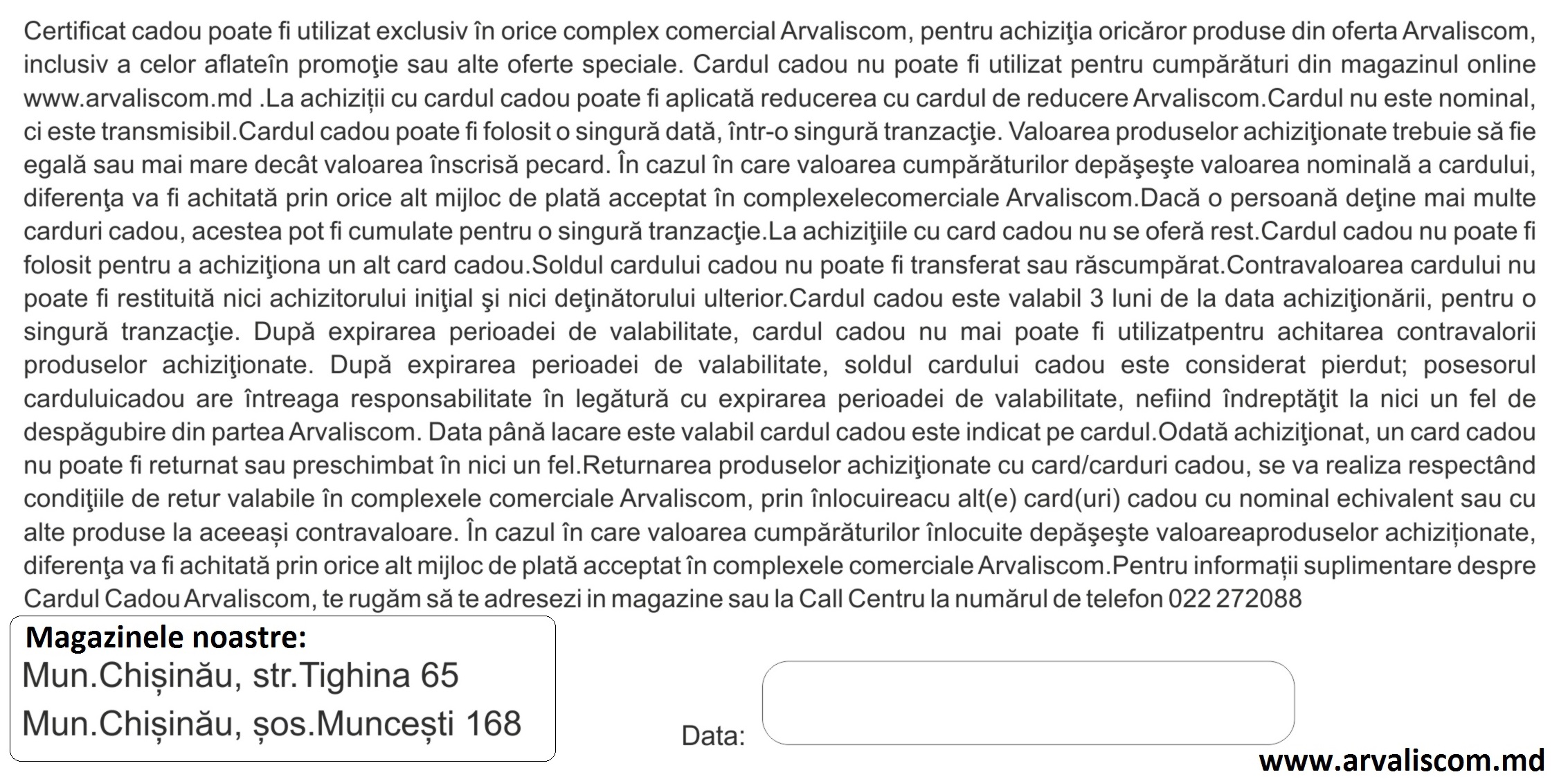 Сертификат подарочный 800 лей Arvaliscom