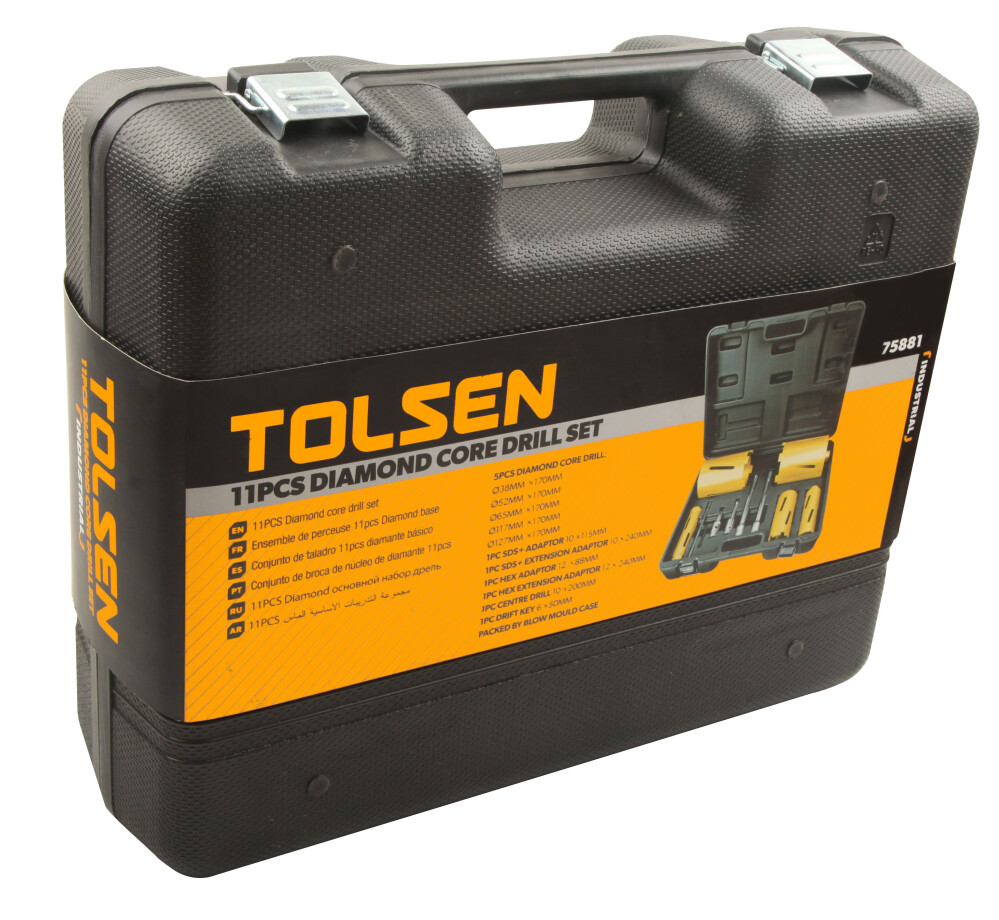Алмазное покрытие коронок – повышает скорость сверления и значительно увеличивает срок службы в твёрдых материалах. Удлинители SDS+ и hex‑адаптеры – возможность глубокой и разнообразной установки в разных условиях. Ударопрочный кейс – защищает инструменты, облегчает транспорт и хранение.