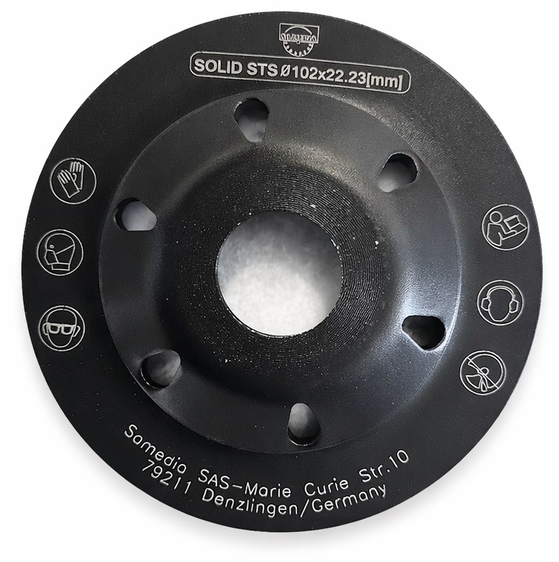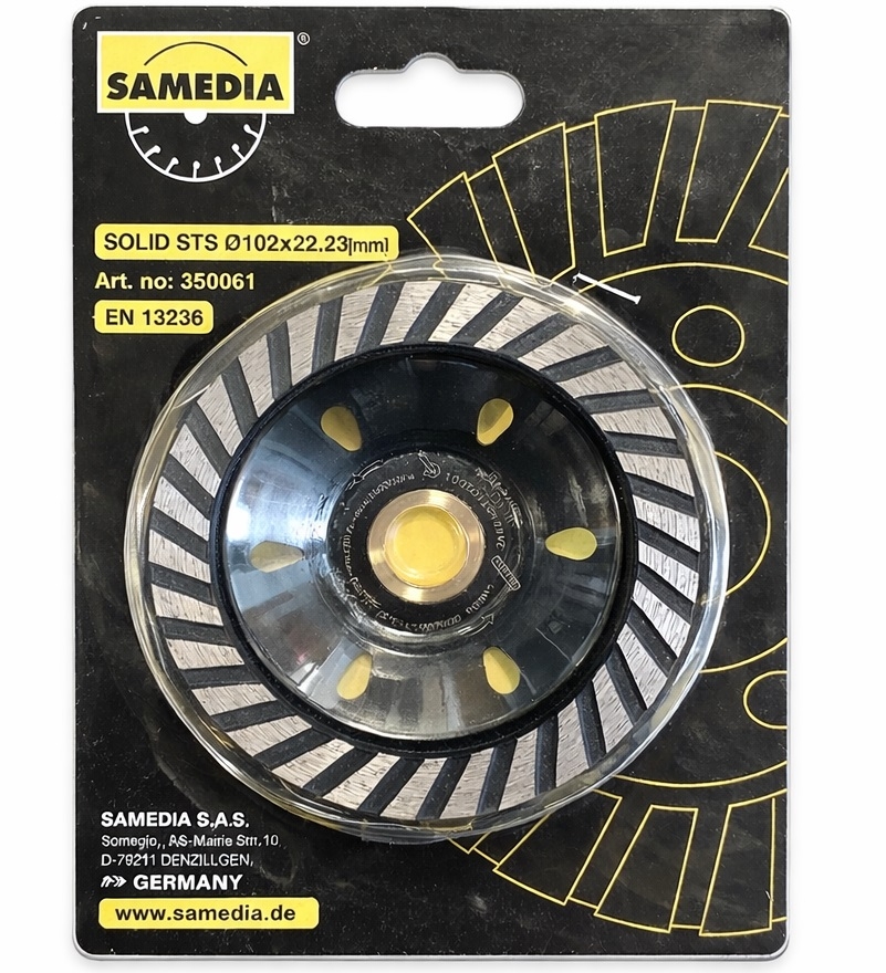 Турборезная кромка диска помогает быстро и равномерно обрабатывать бетонную поверхность, повышая скорость шлифовки без вибраций и заусенцев Сегменты диска спечены непосредственно с рабочей основой, что обеспечивает прочность соединения и продолжительный срок службы даже при интенсивной эксплуатации. Samedia SOLID STS — это профессиональный стандарт качества от европейского производителя Samedia, сочетая надежность, соответствие нормам и доступную цену для повседневного использования
