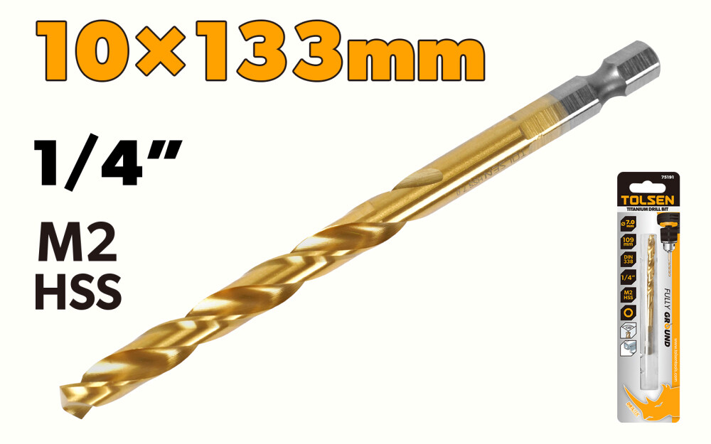 Титановое нитридное покрытие (TiN): защищает от износа, улучшает скольжение, увеличивает ресурс сверла. Хвостовик 1/4″ шестигранный quick‑release: позволяет быстро менять сверла без потери фиксации. Разделённый центр (split point) 135°: обеспечивает мгновенное центрирование и исключает срыв при старте.