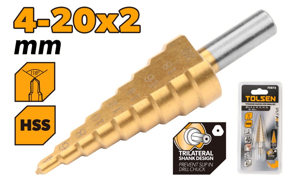 - Сверло по металлу ступенчатое 4-20мм Tolsen