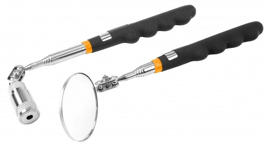 Бифункциональность набора — наличие и зеркала, и магнитного захвата, позволяет одновременно освещать, визуализировать и подцеплять детали. Диаметр зеркала 50 мм — обеспечивает широкий угол обзора в труднодоступных зонах.