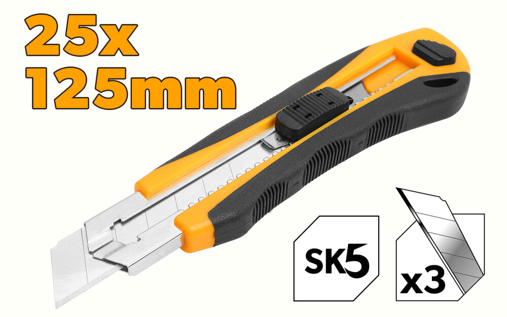 Корпус из ABS-пластика с покрытием TPR обеспечивает приятный, нескользящий хват — нож комфортно держать, он надёжно лежит в руке, что снижает утомляемость и повышает безопасность. Tolsen 30016 подходит для резки самых разных материалов — бумага, картон, плёнка, линолеум, упаковка, мягкий пластик — что делает его полезным как в быту, так и на стройке, в ремонте или при оформлении. Лезвие шириной 25 мм, сегментированное, выдвижное — позволяет по мере износа откалывать использованный сегмент и получать острый край снова, без необходимости замены всего лезвия. Это удобно при частой резке и экономит расходный материал.