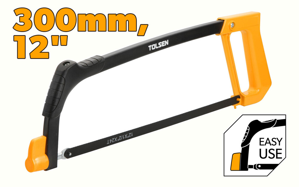 Рамка ножовки выполнена из стальной квадратной трубки с порошковым покрытием, что обеспечивает высокую механическую прочность, устойчивость к нагрузкам и долговечность. Такой корпус лучше выдерживает давление при распиле металла и сохраняет геометрию инструмента при многократных нагрузках. Несмотря на то, что ножовка рассчитана на металл, её можно применять и для распила иных твёрдых материалов — например, труб, профилей, заготовок — что делает её полезной в мастерской, гараже или бытовом хозяйстве.