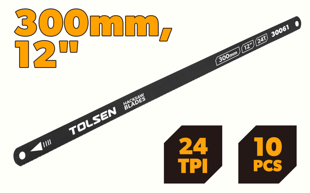 Пилы изготовлены из углеродистой стали, что обеспечивает высокую прочность и устойчивость к износу при работе с металлическими загатовками. Даже при частой эксплуатации инструмент сохраняет форму зубьев и рабочие качества. Полотно подходит для различных видов ножовок и металлических заготовок — от тонких профилей до более массивных деталей. Это делает Tolsen 30061 подходящим как для бытового, так и профессионального использования.