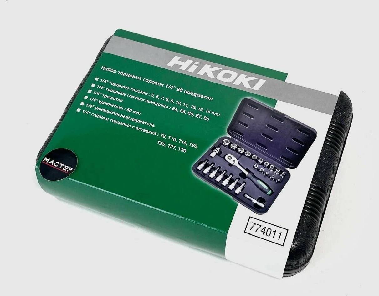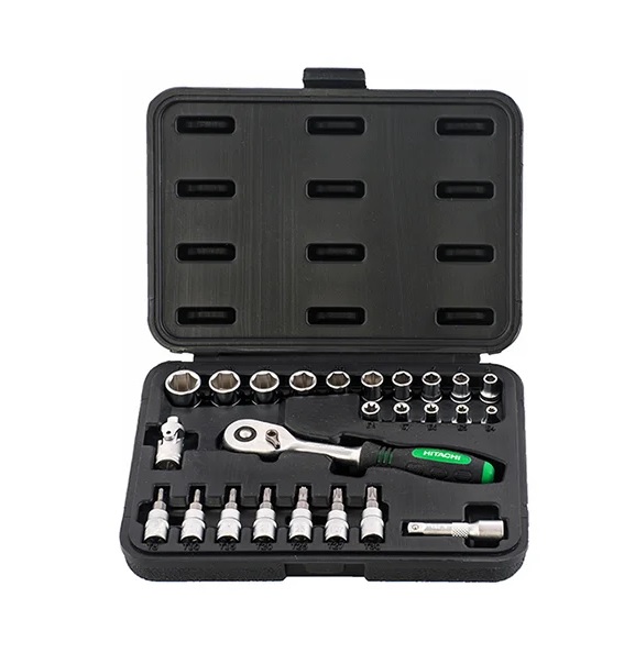 Пластиковый кейс используется для хранения и транспортировки набора торцевых головок Hitachi. Все предметы аккуратно уложены и прочно закреплены в специальных нишах. Рукоятка трещотки выполнена из двухкомпонентного материала и не скользят в ладони.