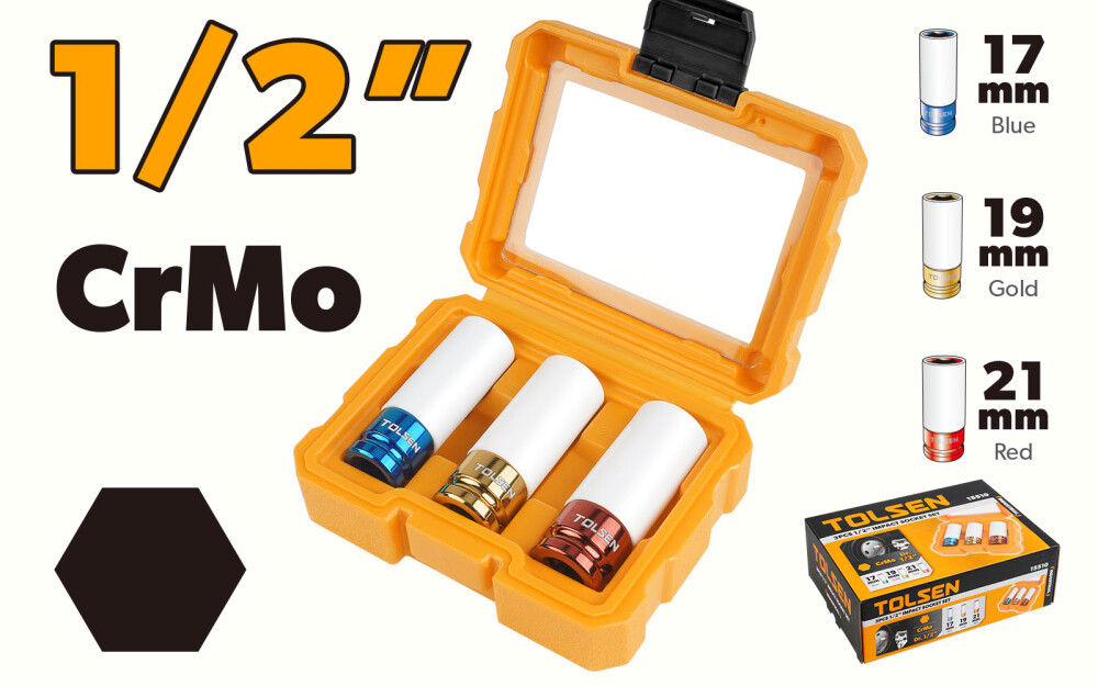 Набор включает 3 наиболее востребованных размера — 17 мм, 19 мм и 21 мм, что делает его удобным решением для работ с крепёжными элементами средней величины, часто встречающимися при обслуживании автомобилей и техники Каждая головка имеет поверхность с окрашенным окислительным слоем, что не только защищает металл, но и упрощает визуальную идентификацию размеров при работе в мастерской. Комплект снабжён защитными пластиковыми колпачками (PP) на каждом ключе, что помогает сохранять инструмент в хорошем состоянии и защищать рабочие поверхности головок