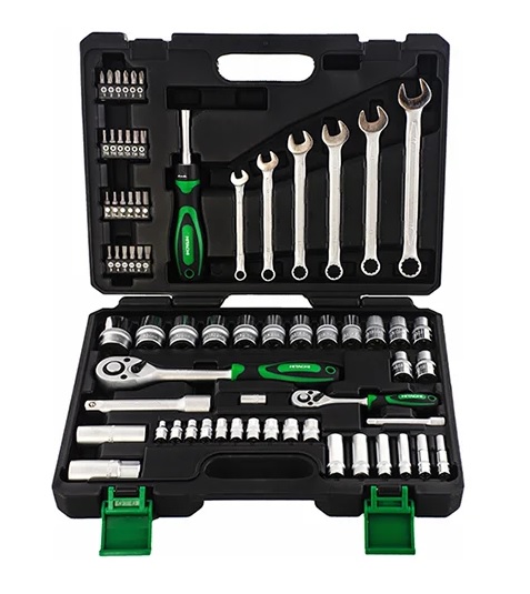 Все предметы уложены и прочно закреплены в специальных нишах. Рукоятки инструментов выполнены из двухкомпонентного материала и не скользят в ладони. Пластиковый кейс используется для хранения и транспортировки набора инструмента 1/4’’ и 1/2” 68 предметов