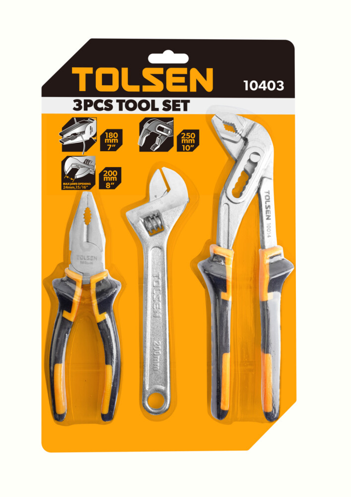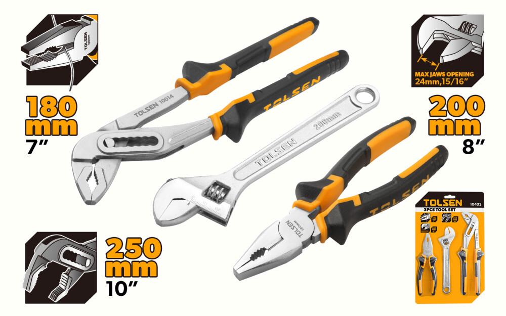 Набор включает комбинированный плоскогубец, водяной ключ и разводной ключ, что делает его универсальным для базовых рабочих задач: захват, регулировка, откручивание и закручивание крепежей. Каждый инструмент сделан из инструментальной стали с никелевым покрытием, что обеспечивает дополнительную защиту от коррозии и повышает срок службы при регулярном использовании.