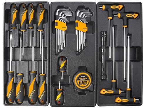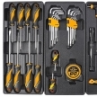 • 10 отверток SL: 6,5×38 мм, 3,0×75 мм, 5,5×100 мм, 6,5×150 мм, 8,0×150 мм PH: PH2×38 мм, PH0×75 мм, PH1×100 мм, PH2×150 мм, PH3×150 мм • 9 шестигранных ключей с шаровидным наконечником и длинной рукояткой: • 1,5, 2, 2,5, 3, 4, 5, 6, 8, 10 мм • 9 шестигранных ключей Torx с длинной рукояткой: T10, T15, T20, T25, T27, T30, T40, T45, T50 • 1 измерительная лента: 5 м/16 футов ×25 мм • 4 Т-образные рукоятки отвертка: H6.0×200 мм, H8.0×200 мм, T30×150 мм, T45×200 мм • 1 шт. телескопический фонарь с 3 светодиодами