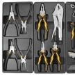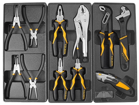 • 1 шт. 180 мм/7" плоскогубцы для внутренних стопорных колец, прямые • 1 шт. 180 мм/7" плоскогубцы для внутренних стопорных колец, изогнутые • 1 шт. 180 мм/7" плоскогубцы для внешних стопорных колец, прямые • 1 шт. 180 мм/7" плоскогубцы для внешних стопорных колец, изогнутые • 1 шт. 200 мм/8" комбинированные плоскогубцы • 1 шт. 200 мм/8" плоскогубцы с длинным носом • 1 шт. 160 мм/6" диагональные кусачки • 1 шт. 250 мм/10" плоскогубцы с фиксатором • 1 шт. 250 мм/10" плоскогубцы для водяного насоса • 1 шт. 250 мм/10" разводной ключ • 1 шт. двухфункциональный универсальный нож: 61x19 мм, включая 2 дополнительных лезвия SK2 • 10 шт. SK5 лезвия: 61x19 мм