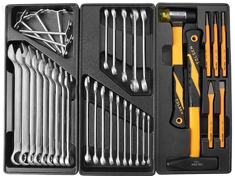 • 5 крючков 6x100 мм • 19 комбинированных гаечных ключей: 6, 7, 8, 9, 10, 11, 12, 13, 14, 15, 16, 17, 18, 19, 20, 21, 22, 23, 24 мм • 5 гаечных ключей для гаек с конусом: 8x10 мм, 11x13 мм, 12x14 мм, 16x18 мм, 17x19 мм • 1 двухсторонний молоток: 35 мм • 1 слесарный молоток: 500 г • 5 пробойников: зубило слесарное: 13x10x150 мм, зубило плоское: 5x10x150 мм, зубило штифтовое: 8x10x150 мм, конусное зубило: 2x10x150 мм, центральное зубило: 3x10x150 мм