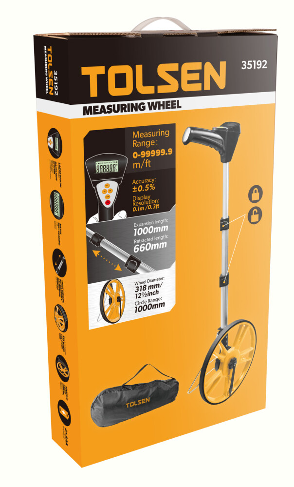Устройство имеет цифровой экран для отображения измеренного расстояния и возможность сохранять предыдущие измерения в памяти, что удобно при выполнении длинных серий измерений без терять промежуточные данные. Колесо диаметром 318 мм позволяет преодолевать неровности дороги и точно измерять большие дистанции, даже на пересечённой местности.