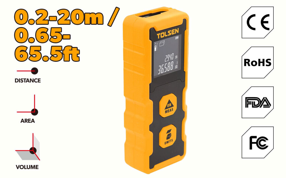 Tolsen 35172 умеет измерять не только расстояние, но и площадь и объём, что существенно расширяет сферы применения — от ремонта до планирования строительных проектов.