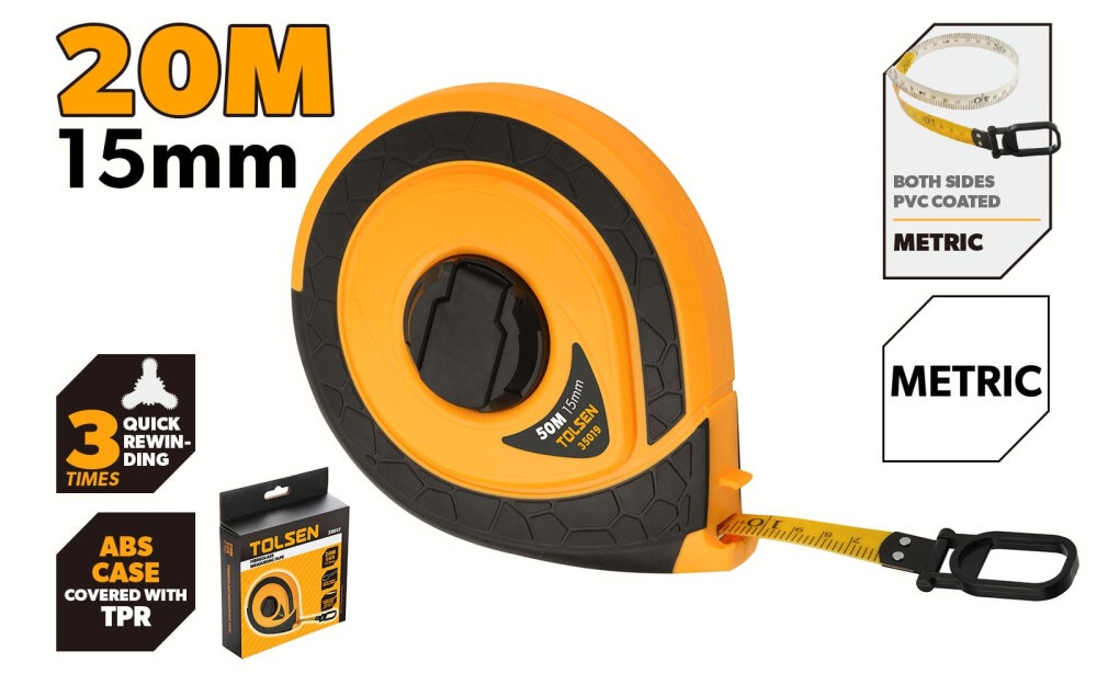 С рулеткой из стекловолокна Tolsen 20 м x 15 мм вы можете быть уверены, что ваши измерения будут точными и долговечными в любых рабочих условиях. Стекловолоконный материал с ПВХ-покрытием делает ленту рулетки износостойкой и устойчивой к атмосферным воздействиям, а корпус из АБС-пластика с покрытием TPR делает рулетку удобной в использовании и ударопрочной. Благодаря четырем скоростям перемотки вы сэкономите время и повысите эффективность работы.