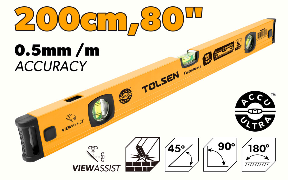 Уровень Tolsen оснащен тремя пузырьковыми уровнями для точных измерений под углами 90°, 180° и 45°. Он также оснащен функцией двойного просмотра для точного считывания уровня. Этот уровень идеально подходит для использования в промышленности, строительстве и других областях, где требуется высокая точность и устойчивость к сложным условиям.