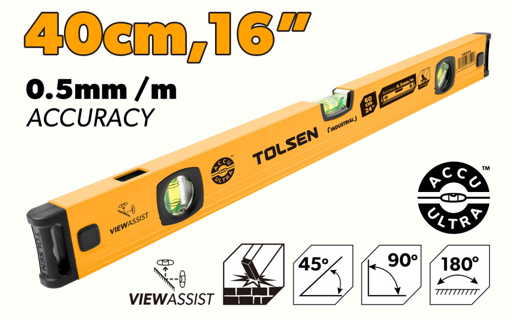 Уровень Tolsen оснащен тремя пузырьковыми уровнями для точных измерений под углами 90°, 180° и 45°. Он также оснащен функцией двойного просмотра для точного считывания уровня. Этот уровень идеально подходит для использования в промышленности, строительстве и других областях, где требуется высокая точность и устойчивость к сложным условиям.