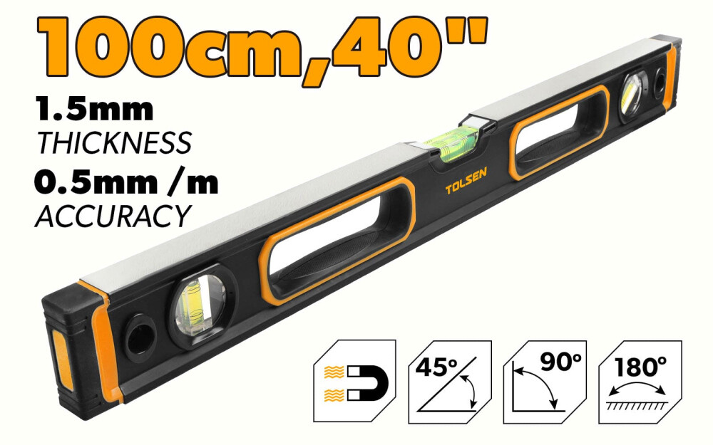 Уровень оснащён мощным магнитом, который надёжно удерживает его на металлических поверхностях, освобождая руки пользователя и делая процесс выравнивания проще и удобнее. Корпус из алюминия обеспечивает оптимальное сочетание лёгкости и прочности, что делает инструмент удобным для длительного использования, при этом он устойчив к ударам и деформациям.