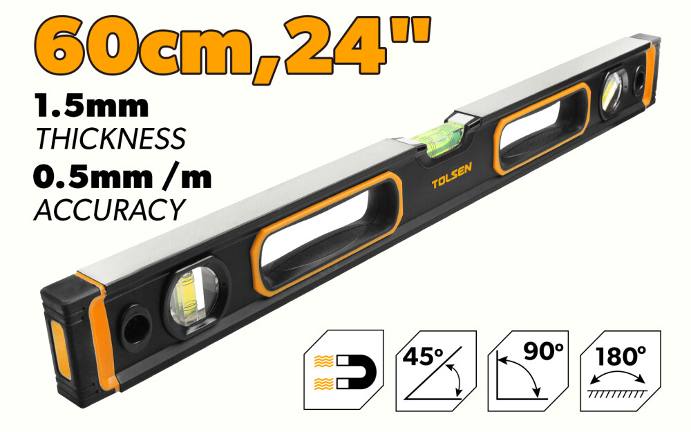Уровень оснащён мощным магнитом, который надёжно удерживает его на металлических поверхностях, освобождая руки пользователя и делая процесс выравнивания проще и удобнее. Корпус из алюминия обеспечивает оптимальное сочетание лёгкости и прочности, что делает инструмент удобным для длительного использования, при этом он устойчив к ударам и деформациям.