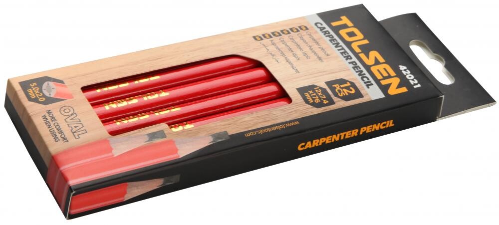 Овальная форма — традиционная для столярных целей — обеспечивает комфорт и точность при разметке. Грифель размером 5 × 2 мм обеспечивает устойчивое нанесение меток даже при плотных и твёрдых материалах. Набор в 12 штук и качественная упаковка — удобство на стройке и при хранении.