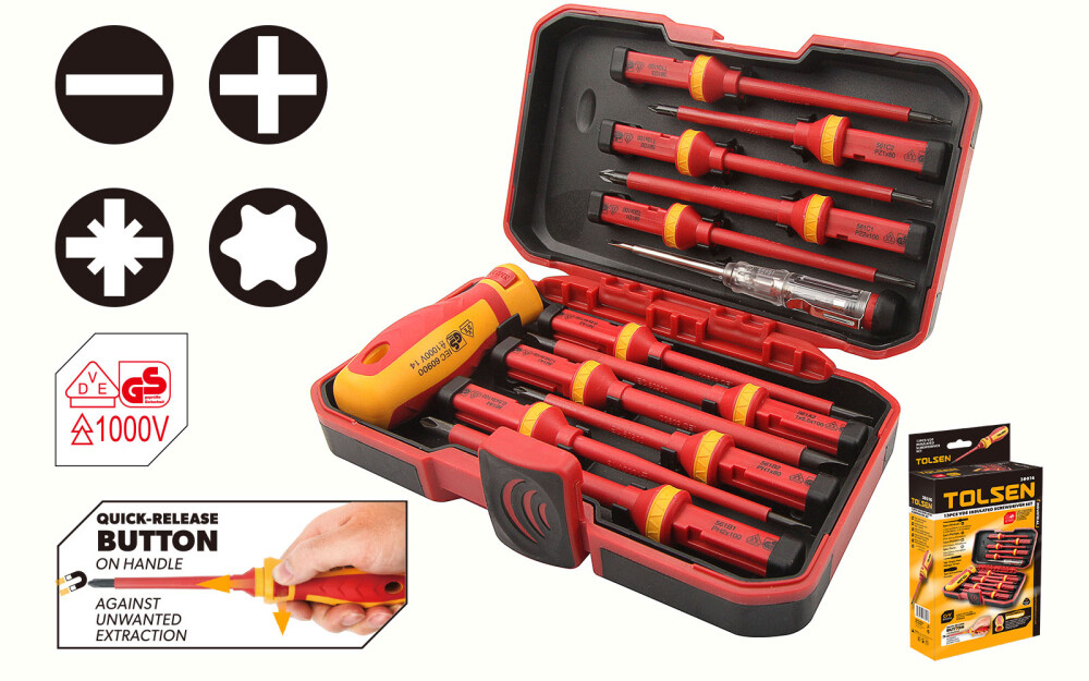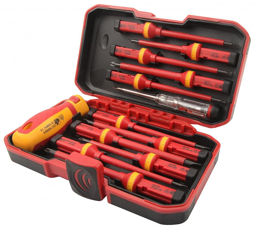 Каждый инструмент в комплекте имеет изоляцию, рассчитанную на работу под напряжением до 1000 В, и проходит сертификацию VDE/GS — это обеспечивает защищённость электрика и безопасность работы на объектах с повышенным напряжением. Набор включает 4 шт шлицевых отвёрток, 2 шт Phillips, 2 шт Pozidriv, 3 шт Torx, индикатор напряжения и держатель — что делает его пригодным для большинства монтажных и сервисных задач без необходимости докупать дополнительные инструменты. Инструменты поставляются в жёстком кейсе с организованным расположением каждого элемента, что упрощает хранение, транспортировку и быстрое получение нужной отвёртки прямо на рабочем месте.
