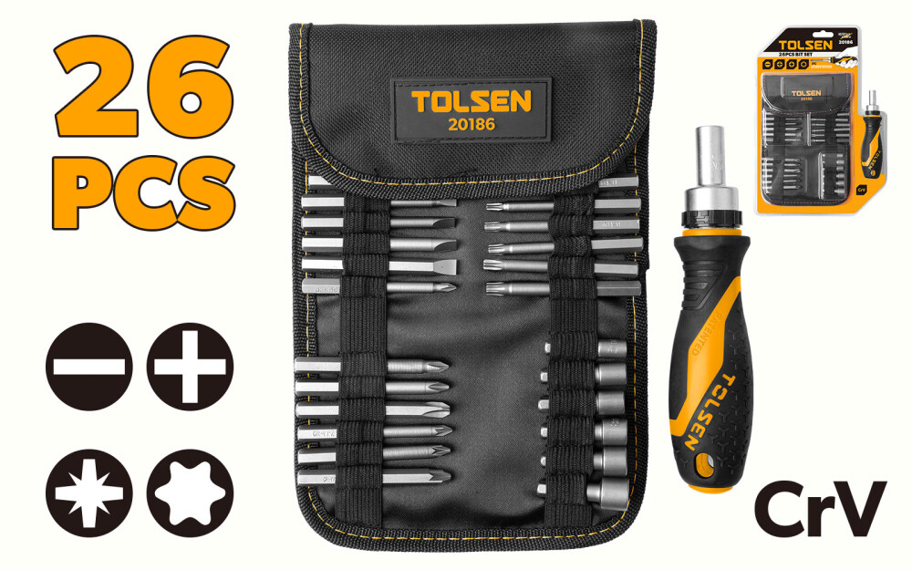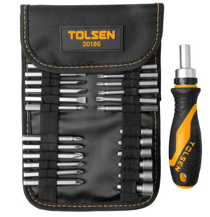 Набор включает широкий спектр бит-насадок с различными профилями (плоские, крестовые, Pozidriv, шестигранные и TORX), что делает его подходящим для работы с большинством типов крепёжных элементов. Отвёртка-трещотка в комплекте снабжена двухкомпонентной рукояткой с противоскользящим покрытием, что повышает комфорт и точность при закручивании/откручивании крепёжных соединений.