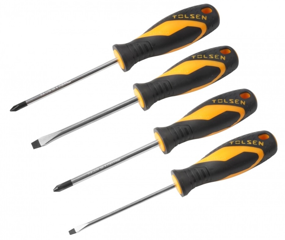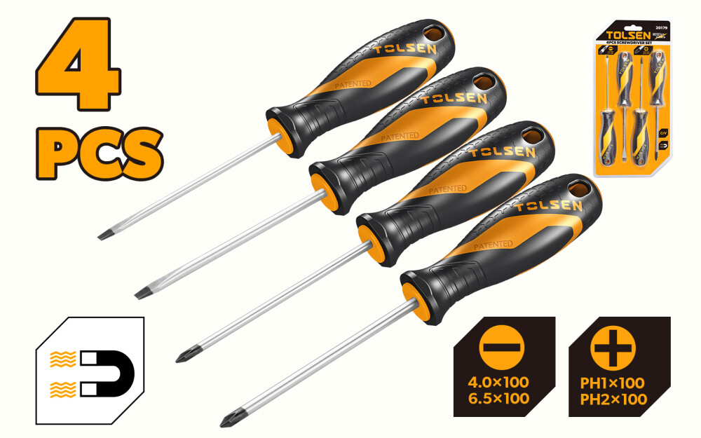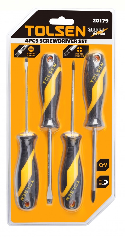 Каждая отвёртка оснащена магнитным наконечником с чёрным финишем, что облегчает удержание винтов и предотвращает их падение при работе в труднодоступных местах, повышая точность монтажа и экономию времени. Рабочие части отвёрток изготовлены из хром-ванадиевой стали (Cr-V), что обеспечивает высокую прочность, устойчивость к износу и долговечность даже при регулярной эксплуатации.