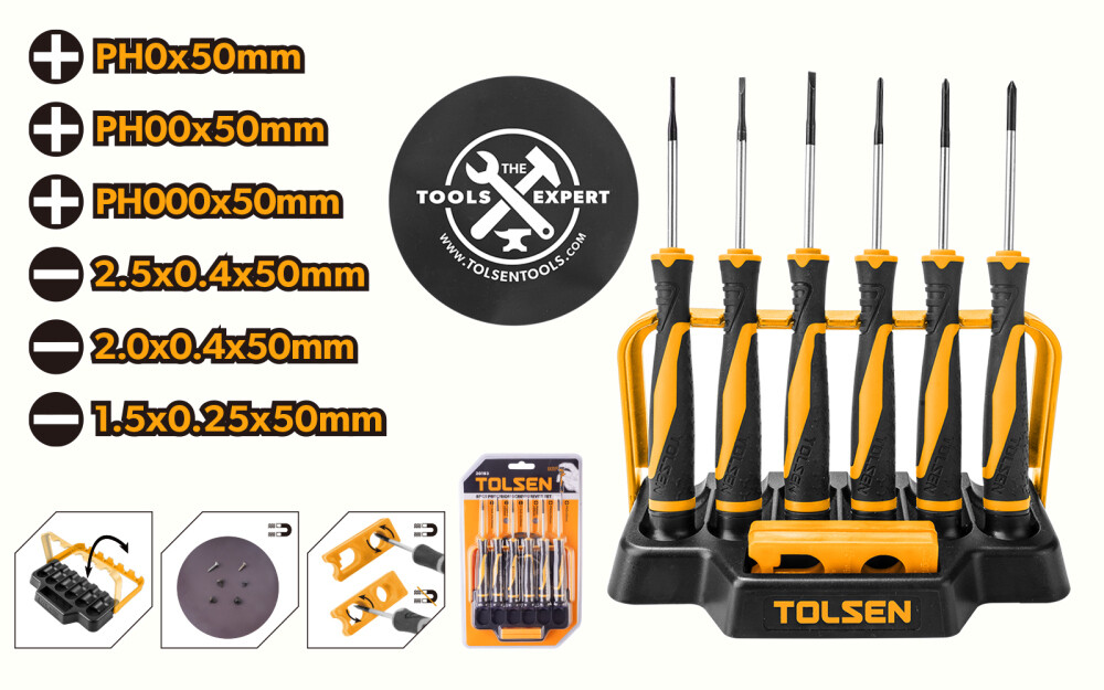 Набор включает шесть разных мини-отвёрток SL и PH, магнитизатор и магнитную подложку — всё, что требуется для надёжной работы с мелкими винтами и деликатными крепёжами, часто встречающимися в электронике и хобби-проектах. Каждая мини-отвёртка оснащена магнитным наконечником с тёмным финишем, что упрощает удержание и позиционирование мелких винтов, предотвращая их выпадение во время работы.