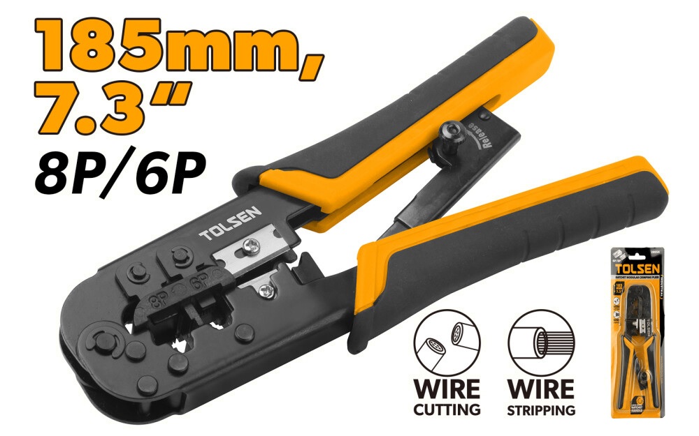 Клещи Tolsen эргономичны и удобны в использовании благодаря двухкомпонентной рукоятке из полипропилена/термопластичной резины. Компактный и прочный модуль оснащен каналом W/KEY в модульном держателе 8P, что упрощает и делает более эффективной резку и зачистку проводов.С помощью клещей Tolsen вы сможете обжимать следующие типы модульных розеток: 8P8C/RJ45 8P6C 8P4C 8P2C 6P6C/RJ12 6P4C/RJ11 6P2C Кроме того, клещи оснащены устройством для разгрузки натяжения круглого кабеля. Эта функция делает резку и зачистку проводов проще и эффективнее.