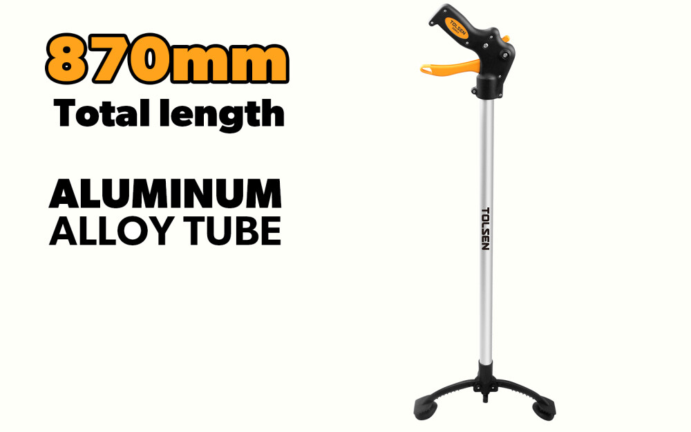 Штанга изготовлена из алюминиевого сплава, что делает инструмент одновременно лёгким и достаточно прочным, не подверженным ржавчине и воздействию влаги, при этом удобным в транспортировке и использовании на улице. Механизм блокировки на ручке позволяет зафиксировать захват в закрытом положении, что делает его компактным для хранения и предотвращает случайные срабатывания или падения предметов. «Челюсти» (захватные губки) снабжены резиновыми накладками, которые обеспечивают надёжное сцепление с предметами, уменьшают риск повреждения поверхности и предотвращают проскальзывание, особенно на гладких или влажных объектах.
