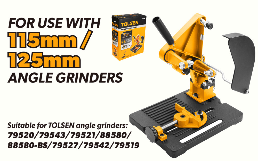 Standul este conceput pentru a susține polizoare cu discuri de 115 mm și 125 mm, oferind compatibilitate largă cu modele diferite Unghiul la care este poziționat polizorul poate fi reglat între 0° și 45°, oferind flexibilitate în lucrări de tăiere și șlefuire. Standul are un corp robust de aluminiu turnat, oferind durabilitate și greutate redusă, facilitând montarea și manipularea.