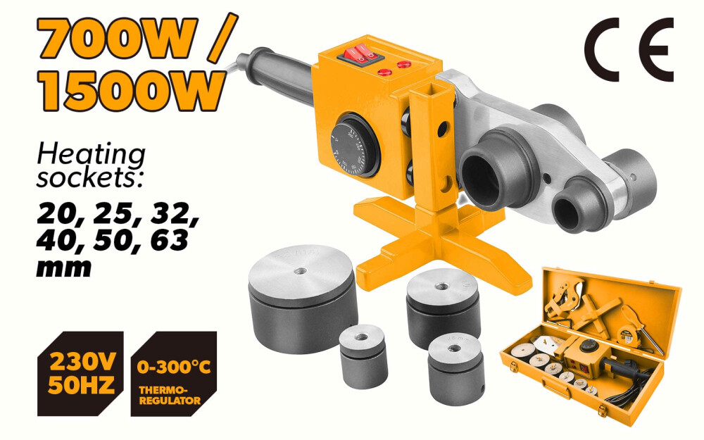 Permite alegerea puterii potrivite în funcție de diametrul țevii. Compatibil cu diametre variate 20–63 mm — flexibilitate mare pentru diverse tipuri de țevi. Set complet cu accesorii utile — include bandă de măsurare, cutter, șurubelniță pentru confort la instalare. Potrivit pentru mai multe tipuri de țevi plastice — PP-R, PB, PE, PE-RT etc. — versatilitate la diverse lucrări de instalații.