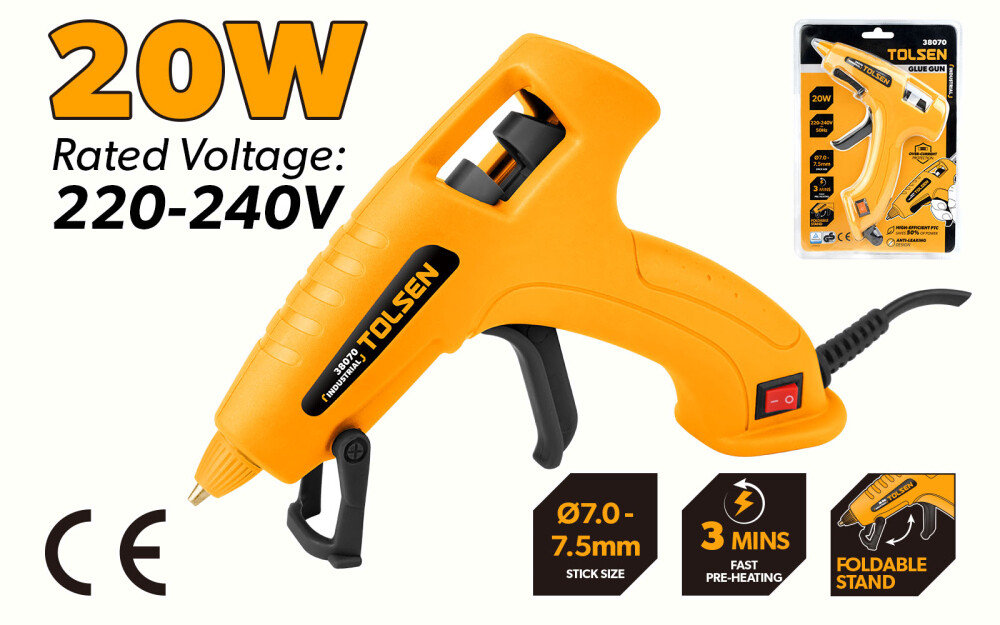 Unealta este echipată cu un încălzitor PTC care asigură o temperatură stabilă de lipire, reduce consumul de energie comparativ cu încălzitoarele convenţionale şi extinde durata de viaţă a pistolului de lipit. Modelul Tolsen 38070 dispune de o duză cu protecţie anticoroziune şi un sistem de alimentare controlată a adezivului care reduce semnificativ scurgerile de lipici şi asigură o utilizare curată, chiar şi în exploatare prelungită.