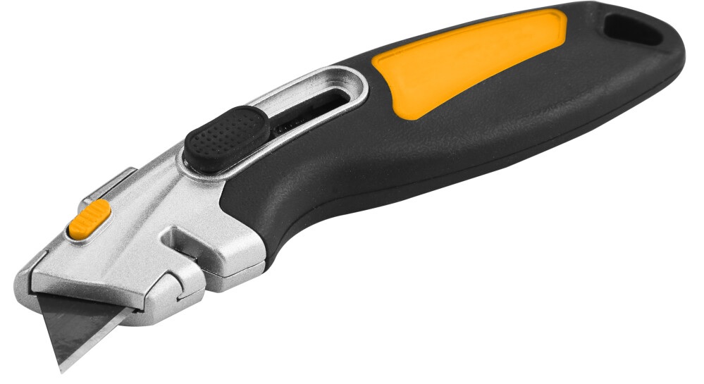 Cuter pentru construcții Tolsen este utilizat în lucrări de finisare, reparații și construcții pentru tăierea materialelor subțiri: hârtie, cauciuc, carton, plastic. Designul constă dintr-o lamă trapezoidală cu două fețe și un corp ergonomic cu inserții antiderapante. Are funcții de blocare a lamei și de întoarcere automată, precum și un opritor și un mecanism de schimbare rapidă a lamei.