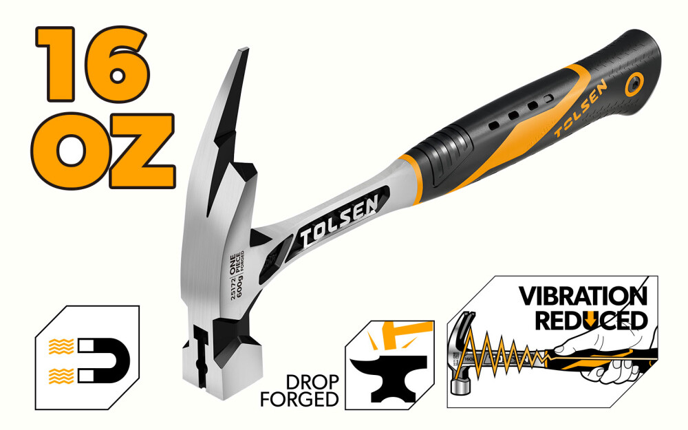Durabilitate excepțională fără puncte slabe. Mâner cu absorbție a șocurilor — Confort sporit și reducerea oboselii. Magnet pentru cuie — Permite prinderea și fixarea cuielor cu o singură mână.