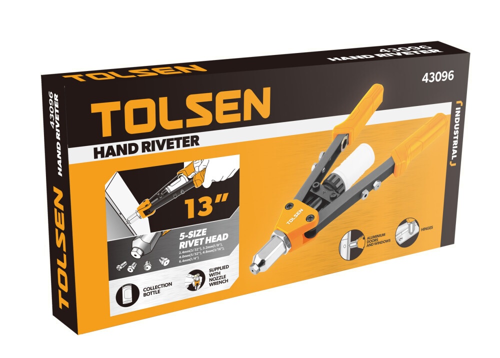 Mânerele nituitoarei cu două mâini sunt cauciucate, ceea ce asigură o prindere sigură și o utilizare confortabilă. Este necesar un recipient de plastic pentru a colecta miezurile de nit uzate.