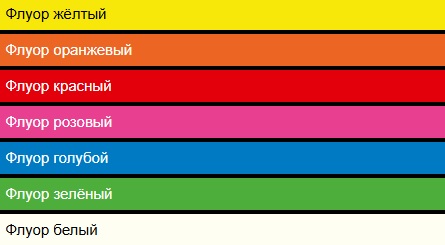 Акриловые краски с большим содержанием флуоресцентных пигментов, которые подчёркивают интенсивность цвета и создают эффект отблеска. Используются для окрашивания надписей, предупредительных знаков, обозначения опасных мест, чтобы подчеркнуть их видимость. Краски можно применять при проведении геодезических и лесных работ, а также с декоративной целью, во флористике на сухие и живые цветы.
